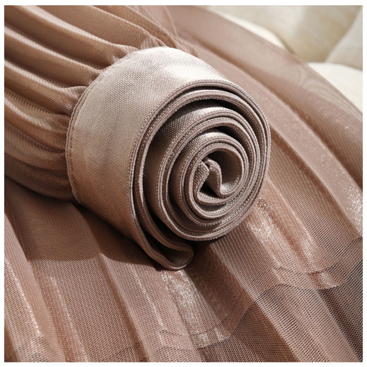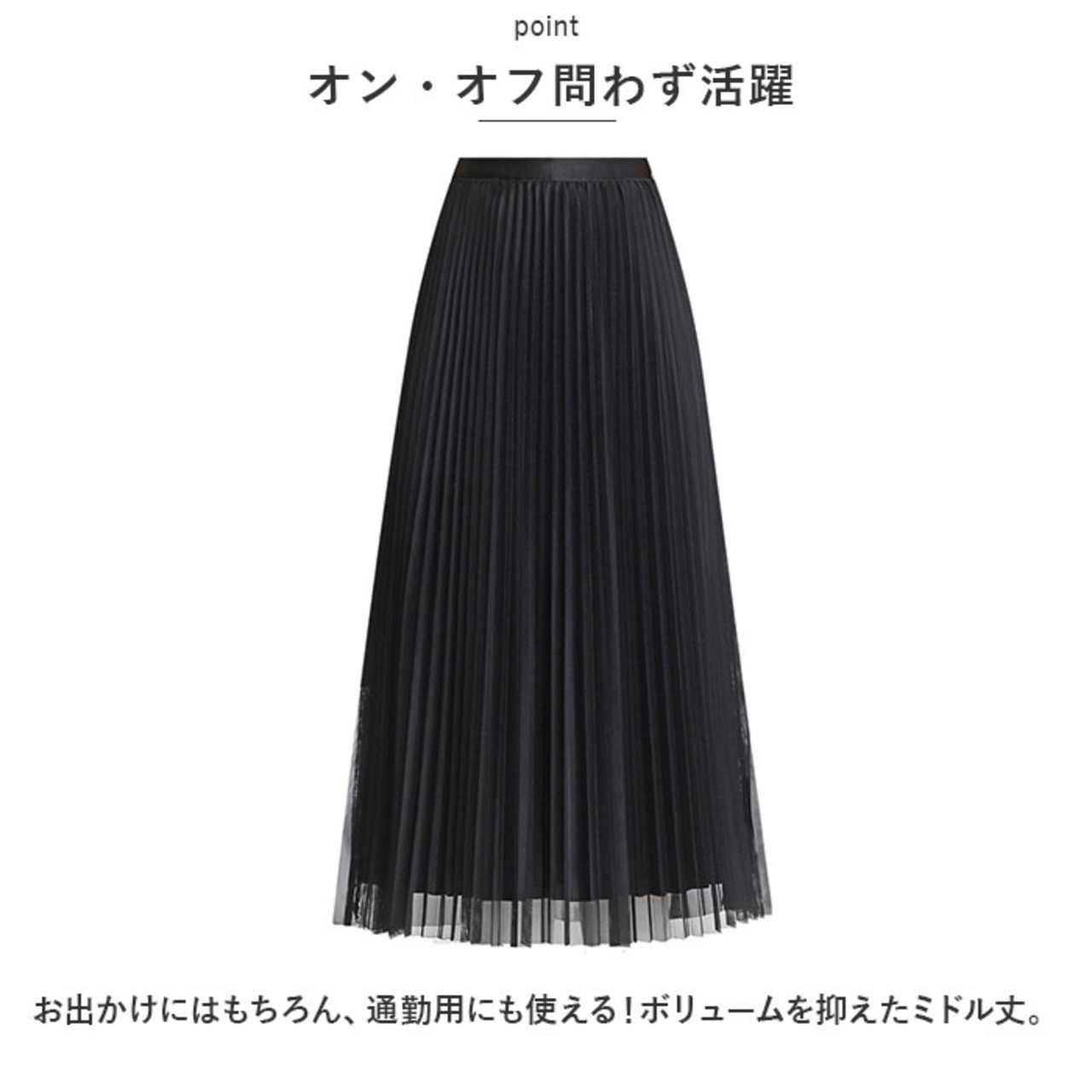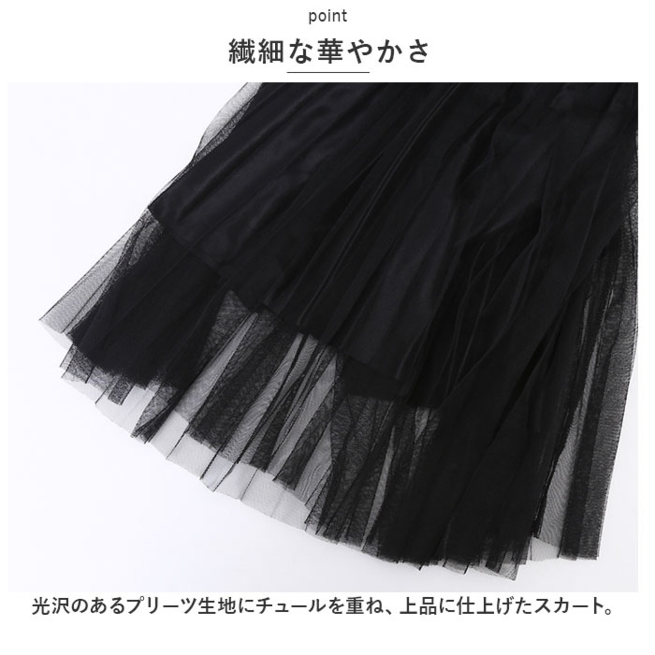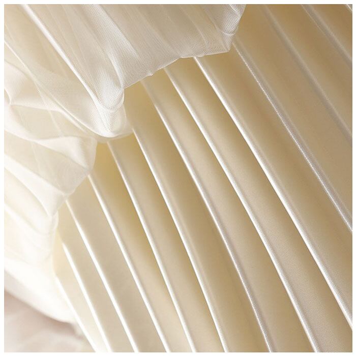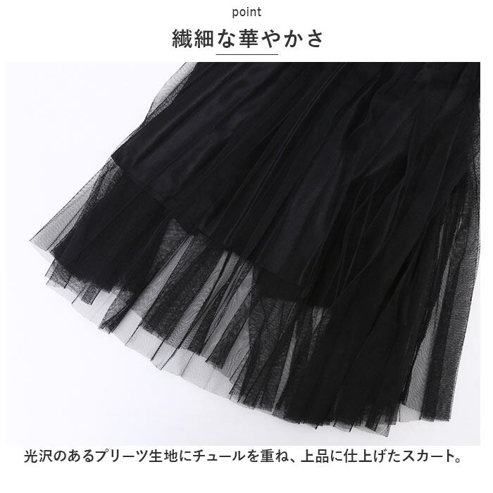 ・光沢のあるプリーツ生地にチュールを重ね、上品に仕上げたスカート。