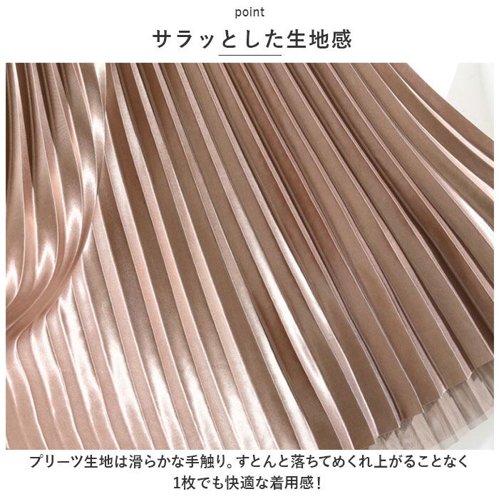 ・プリーツ生地は滑らかな手触り。すとんと落ちてめくれ上がることなく、1枚でも快適な着用感!