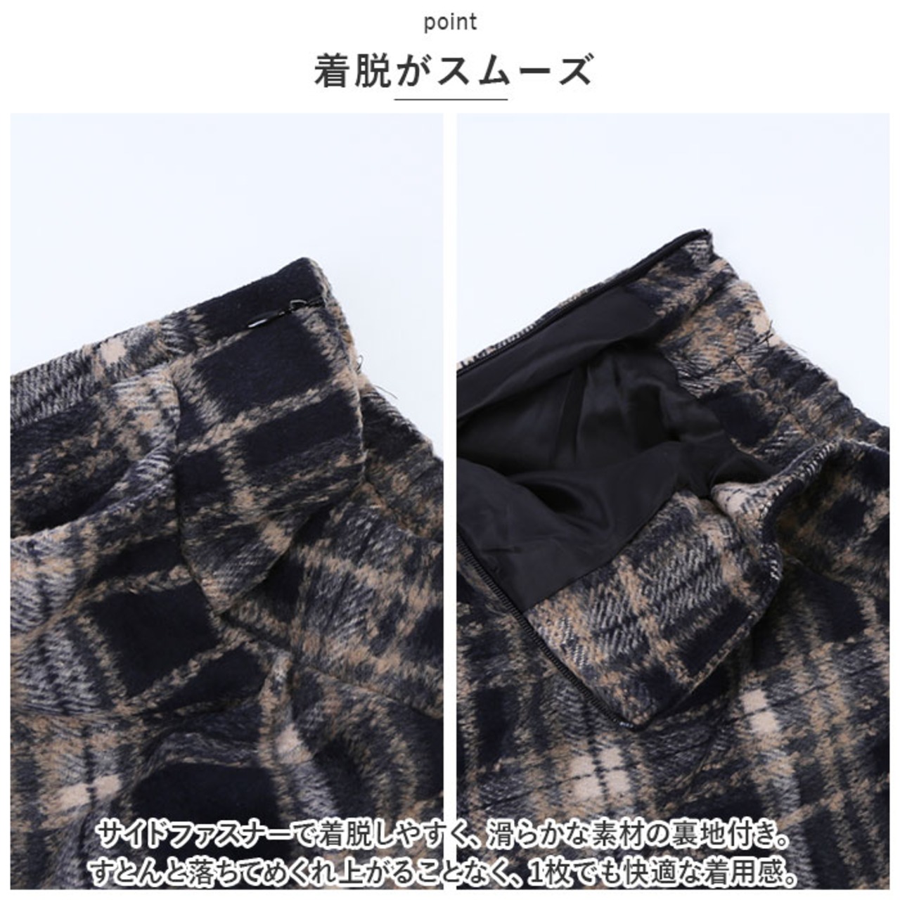 ・サイドファスナーで着脱しやすく、滑らかな素材の裏地付き。すとんと落ちてめくれ上がることなく、1枚でも快適な着用感。