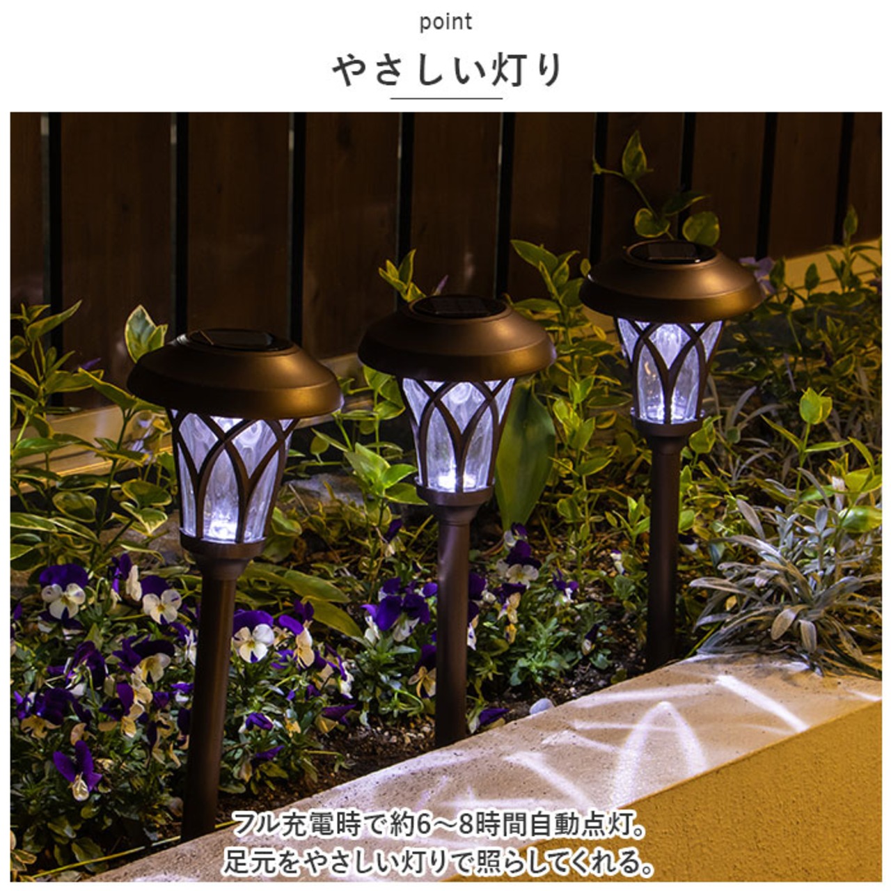 ・フル充電時で約6~8時間自動点灯。足元をやさしい灯りで照らしてくれる。