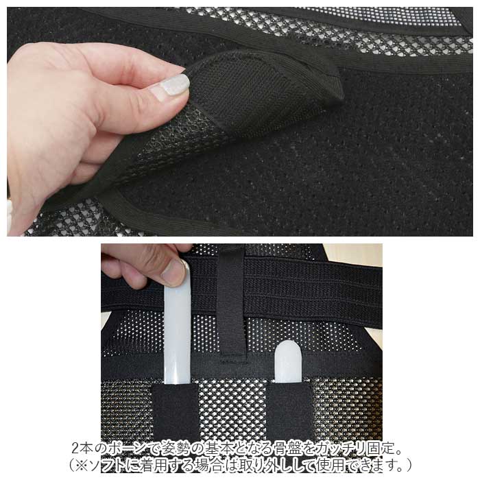 2本のボーンで姿勢の基本となる骨盤をガッチリ固定。(※ソフトに着用する場合は取り外しして使用できます。)