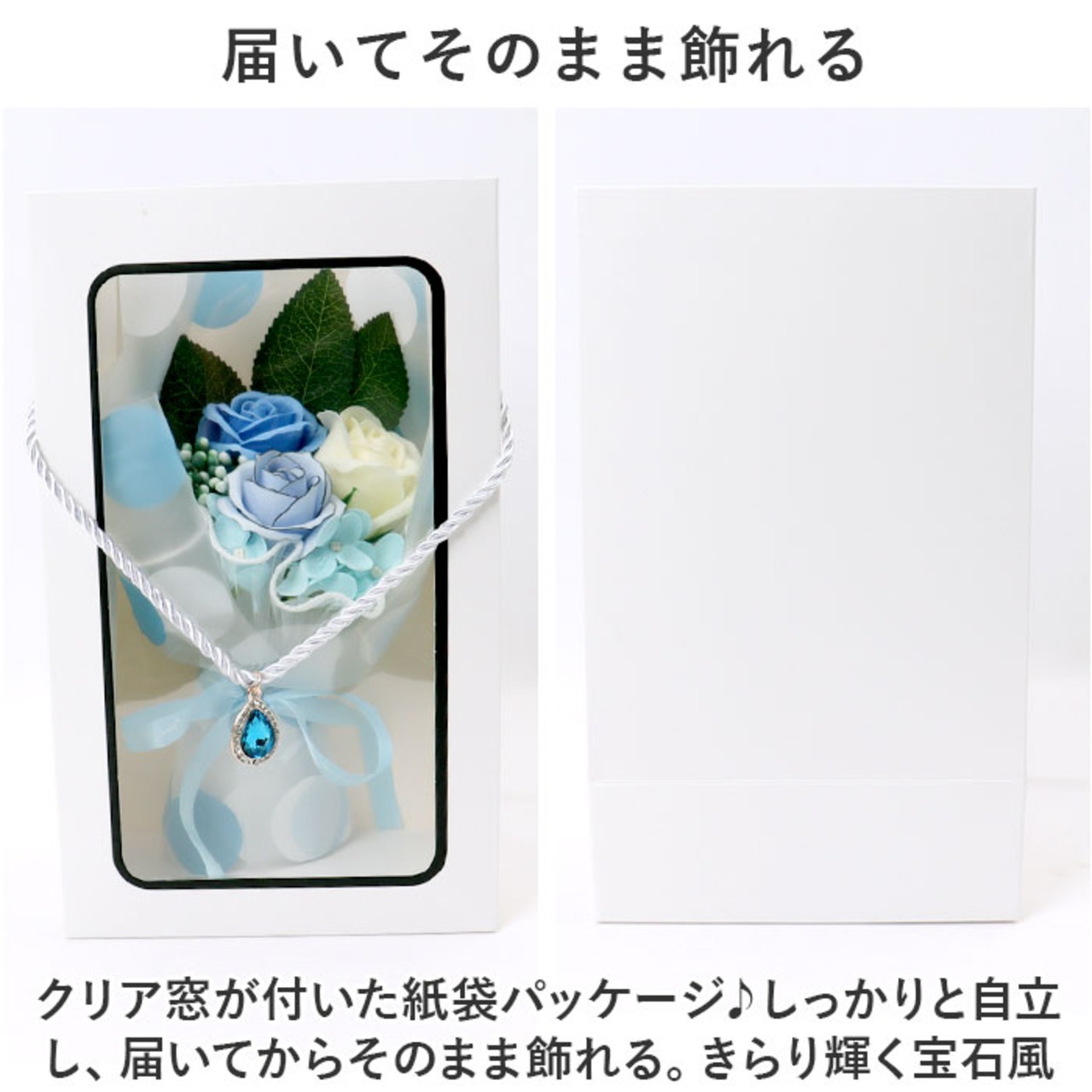 ・クリア窓が付いた紙袋パッケージ♪しっかりと自立し、届いてからそのまま飾れる。きらり輝く宝石風チャーム付き。