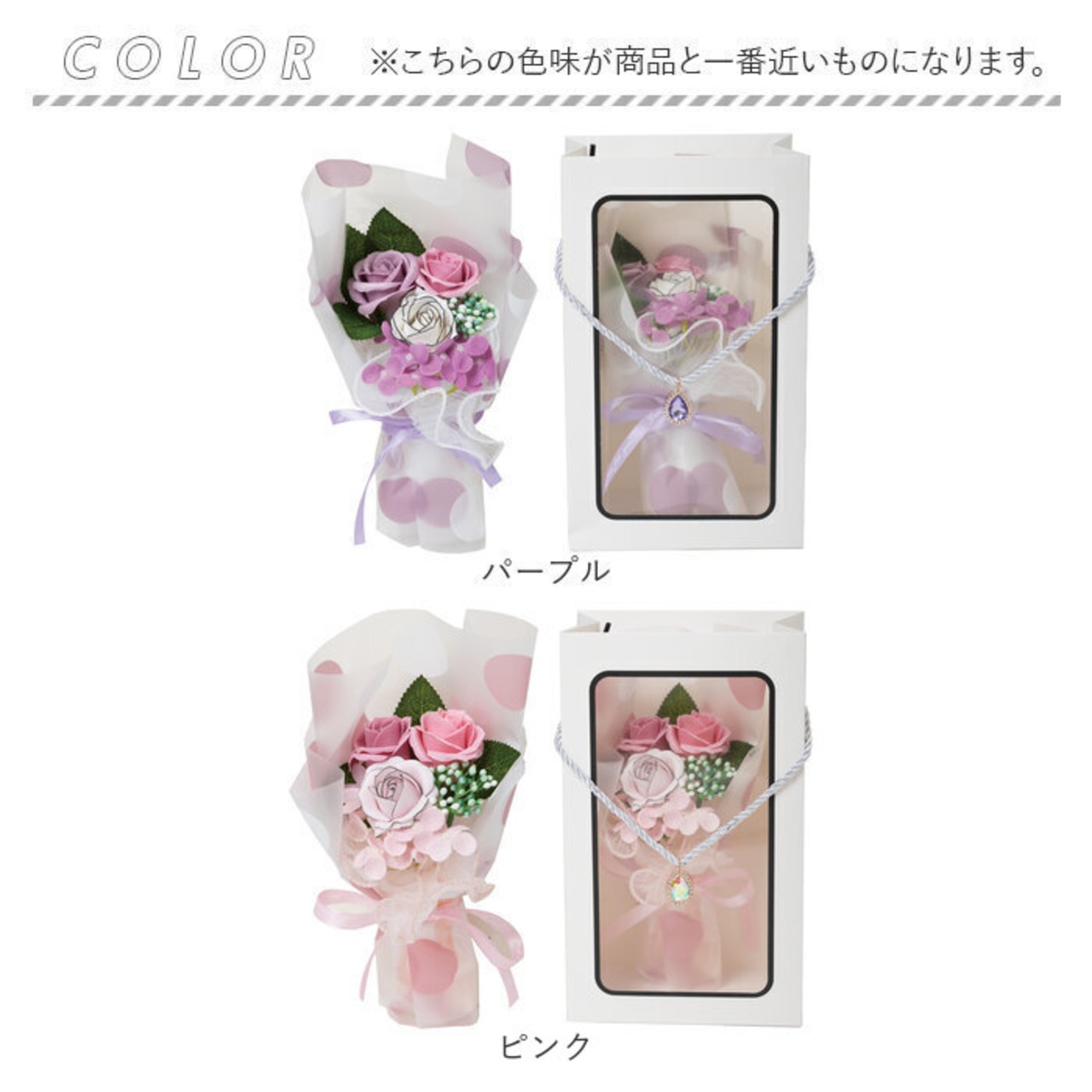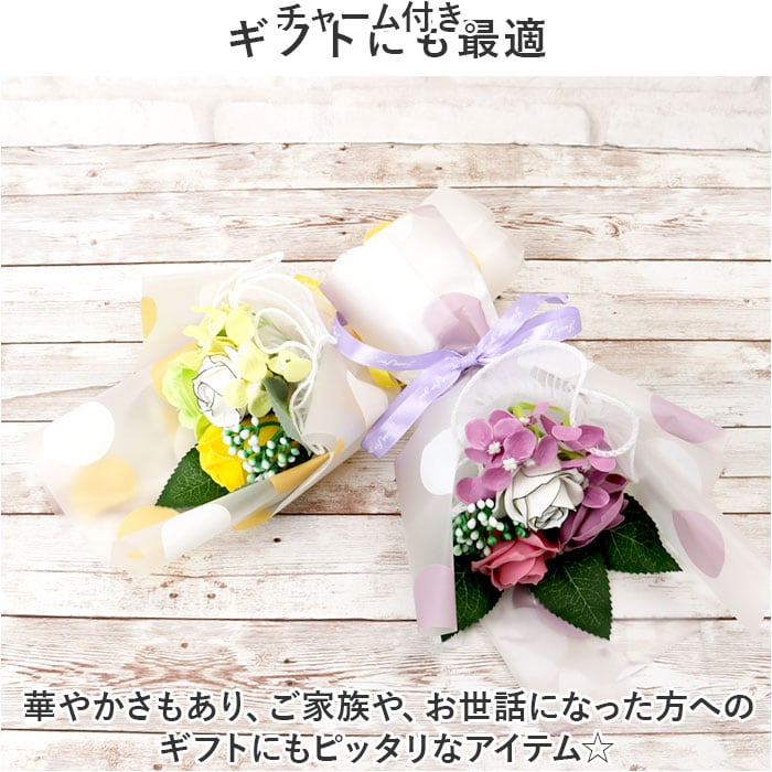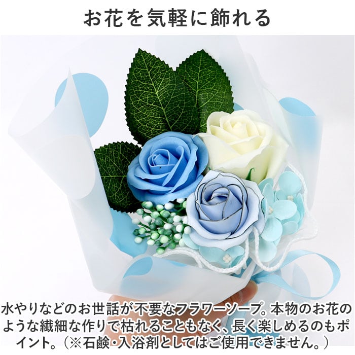 ・水やりなどのお世話が不要なフラワーソープ。本物のお花のような繊細な作りで枯れることもなく、長く楽しめるのもポイント。(※石鹸・入浴剤としてはご使用できません。)