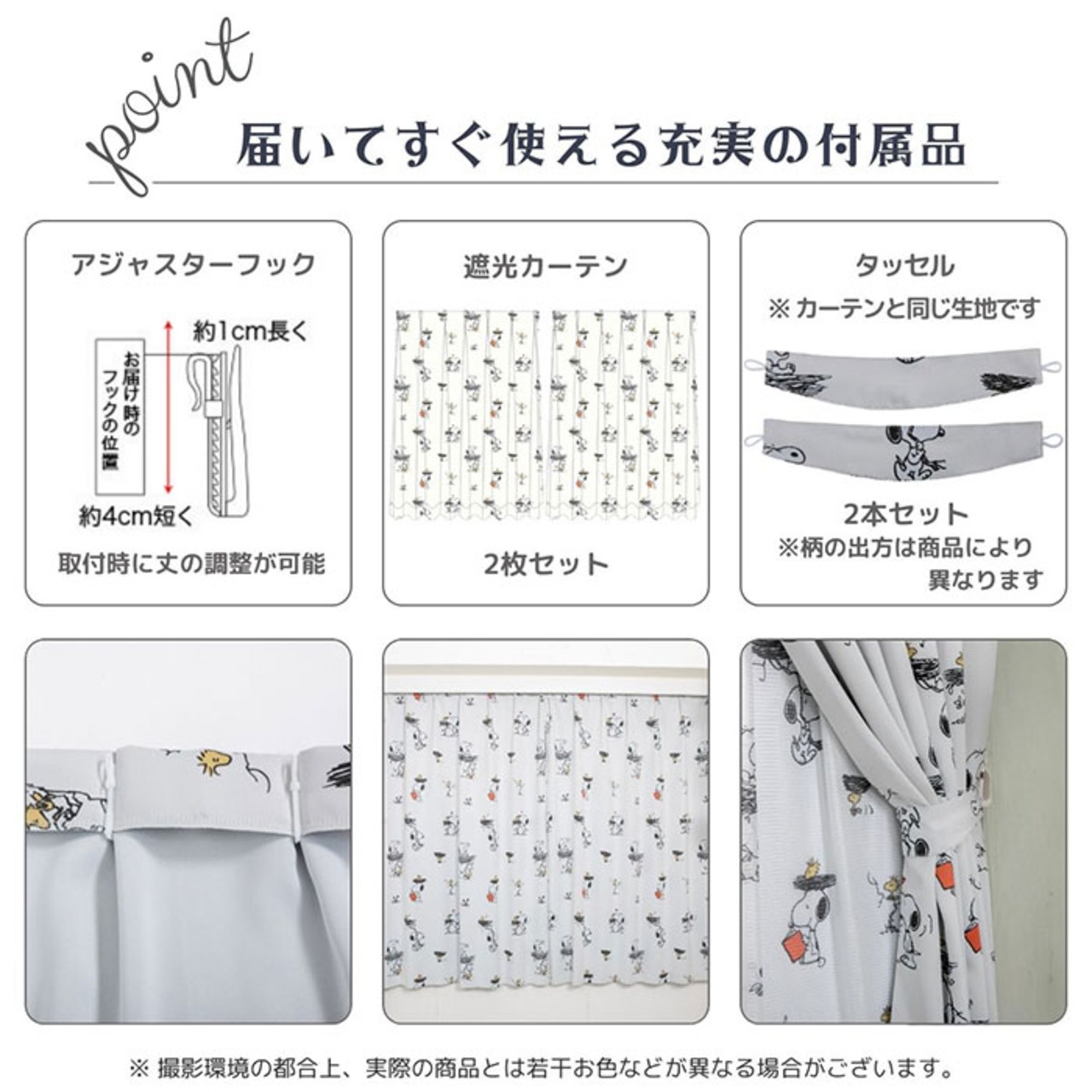 ・カーテン用のアジャスターフックが付属。お部屋の窓のサイズに合わせて、丈感を調節。