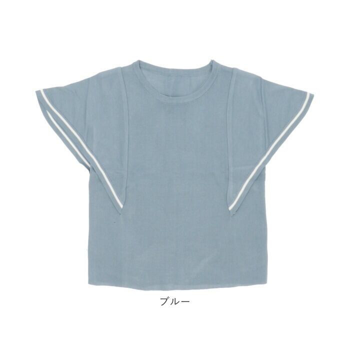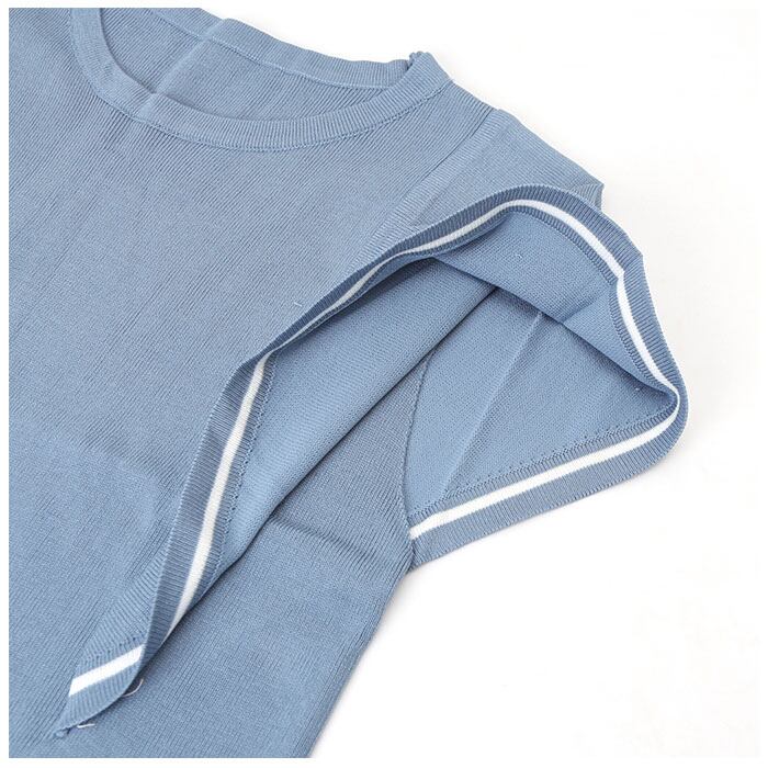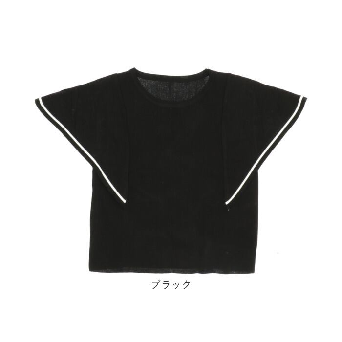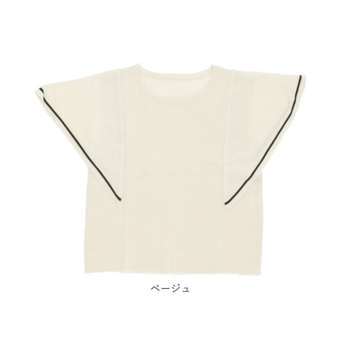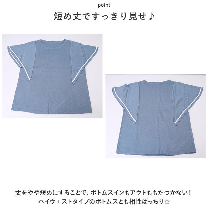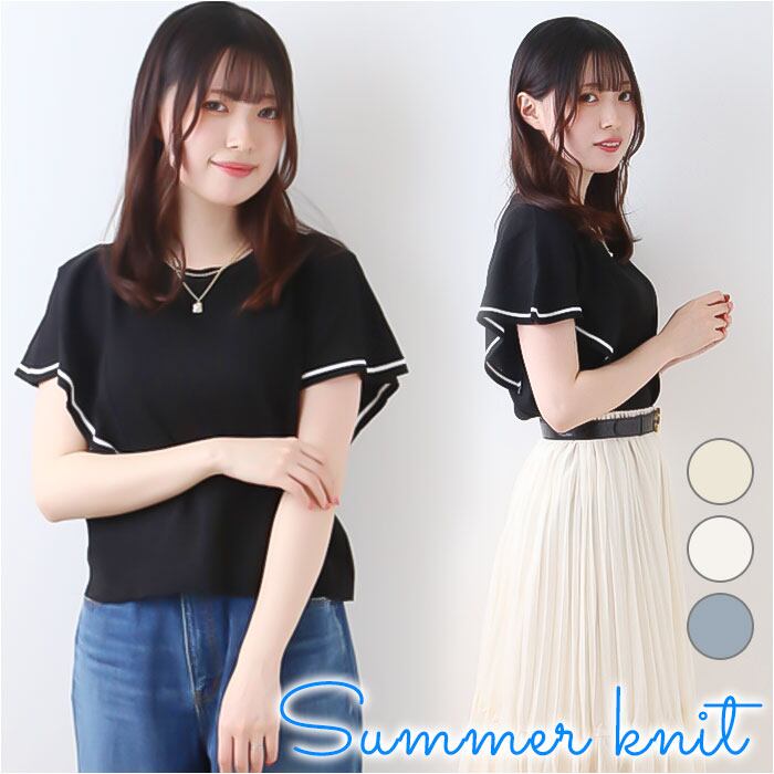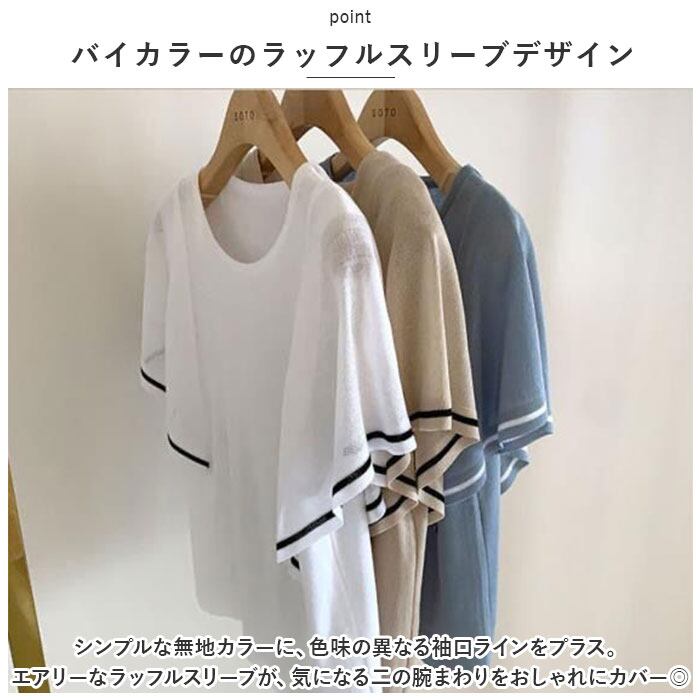 サマーニット 半袖 レディース 通販 ニット 夏 トップス 春夏 きれいめ ゆったり 透け感 二の腕カバー おしゃれ オフィス カジュアル シンプル ライン バイカラー ラッフルスリーブ クルーネック 半袖ニット レディースファッション