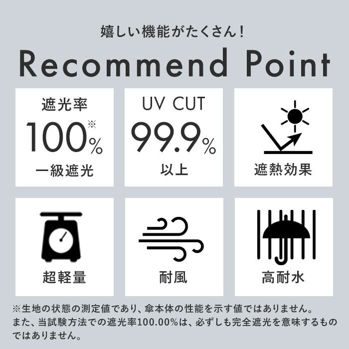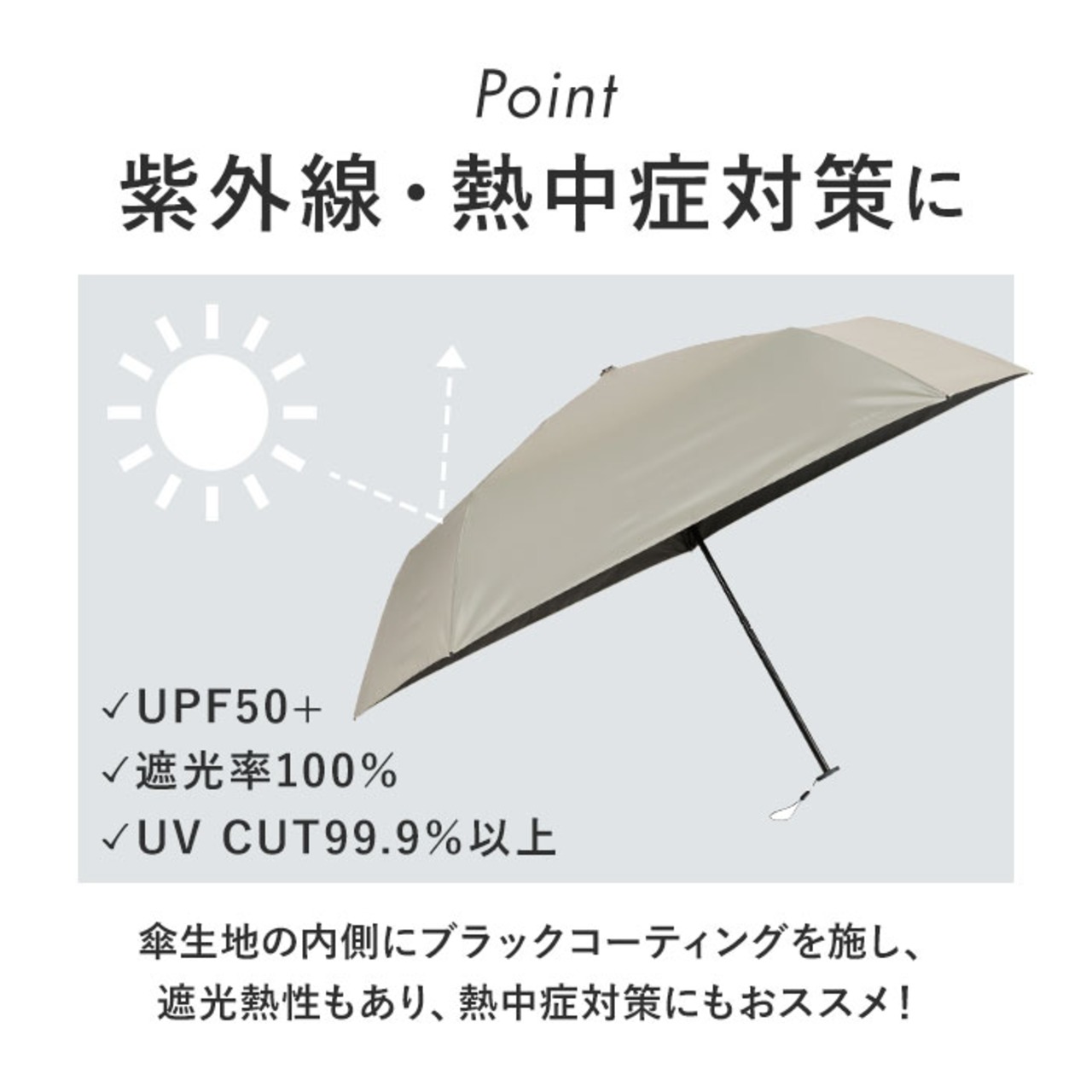 ・傘生地の内側にブラックコーティングを施しUVカット99.9%以上、UPF50+仕様。さらに遮光性もあり、紫外線はもちろん、熱中症対策にもおススメ!