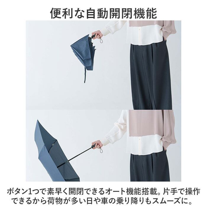 ・ボタン1つで素早く開閉できるオート機能搭載。片手で操作できるから荷物が多い日や車の乗り降りもスムーズに。