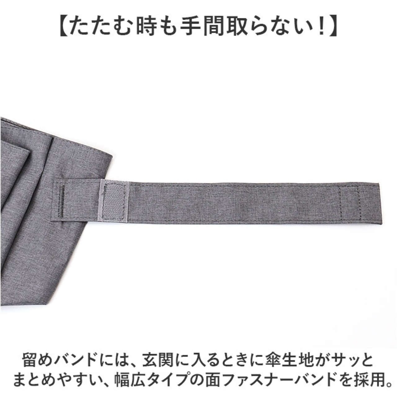 ・留めバンドには、玄関に入るときに傘生地がサッとまとめやすい、幅広タイプの面ファスナーバンドを採用。