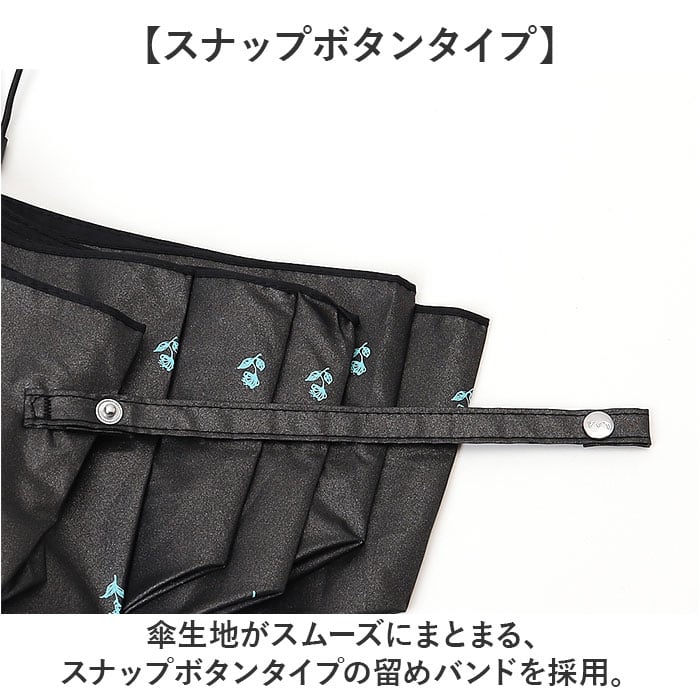 ・傘生地がスムーズにまとまる、スナップボタンタイプの留めバンドを採用。