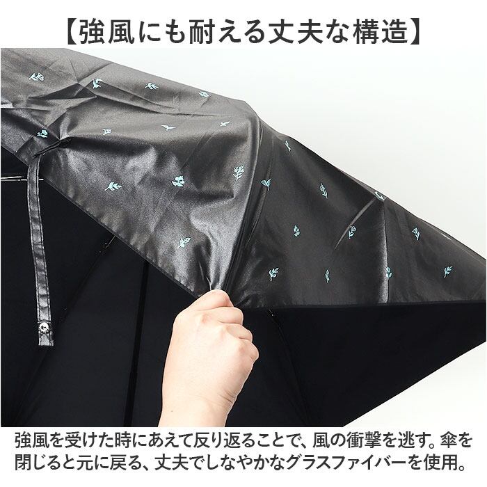 ・強風を受けた時にあえて反り返ることで、風の衝撃を逃す。傘を閉じると元に戻る、丈夫でしなやかなグラスファイバーを使用。