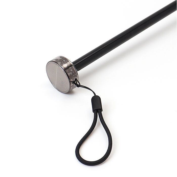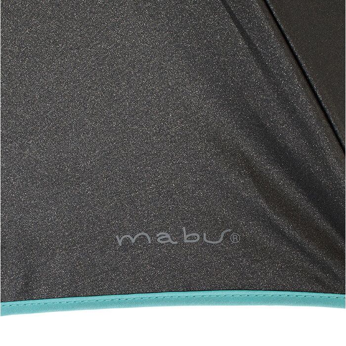 ・ライン使いがアクセントの傘生地と同柄の収納袋にはマブのロゴとテキスト入り。メタルブラックを基調にユニセックスで使える。