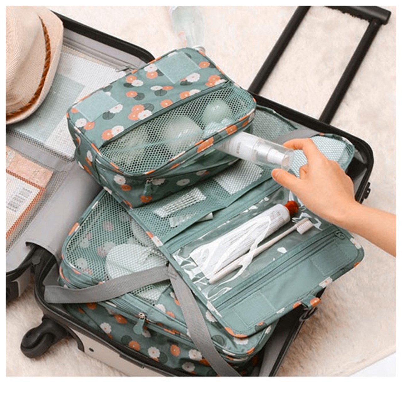 ・メッシュ素材のファスナーポケットは内部にオープンポケット×4付きで、シャンプーやリンスのミニボトル、洗顔フォーム等を立てて収納できる。(※底板付き)