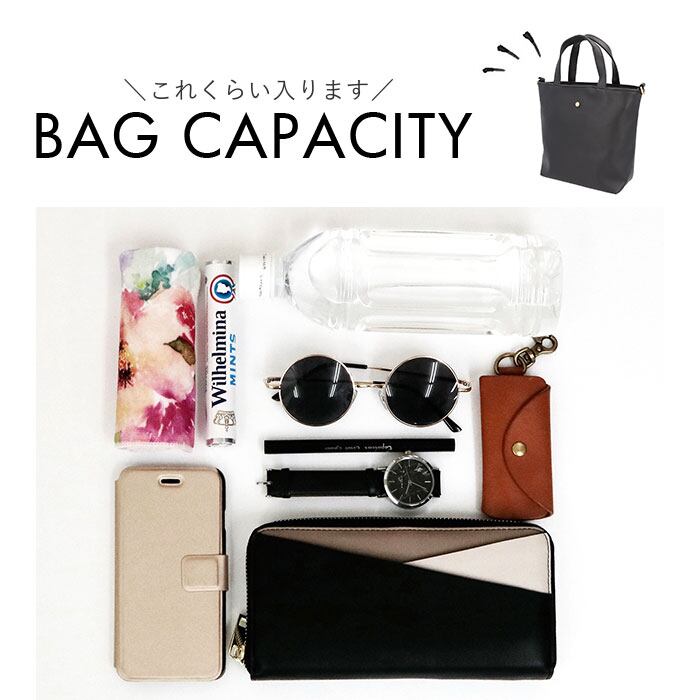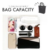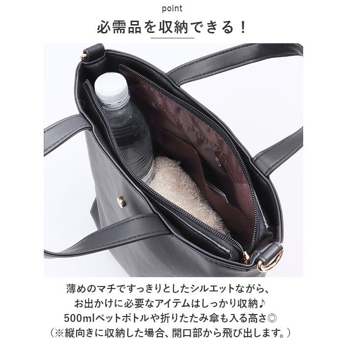 ・薄めのマチですっきりとしたシルエットながら、お出かけに必要なアイテムはしっかり収納♪500mlペットボトルや折りたたみ傘も入る高さ◎(※縦向きに収納した場合、開口部から飛び出します。)
