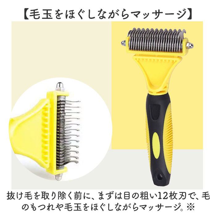 ・抜け毛を取り除く前に、まずは目の粗い12枚刃で、毛のもつれや毛玉をほぐしながらマッサージ。
