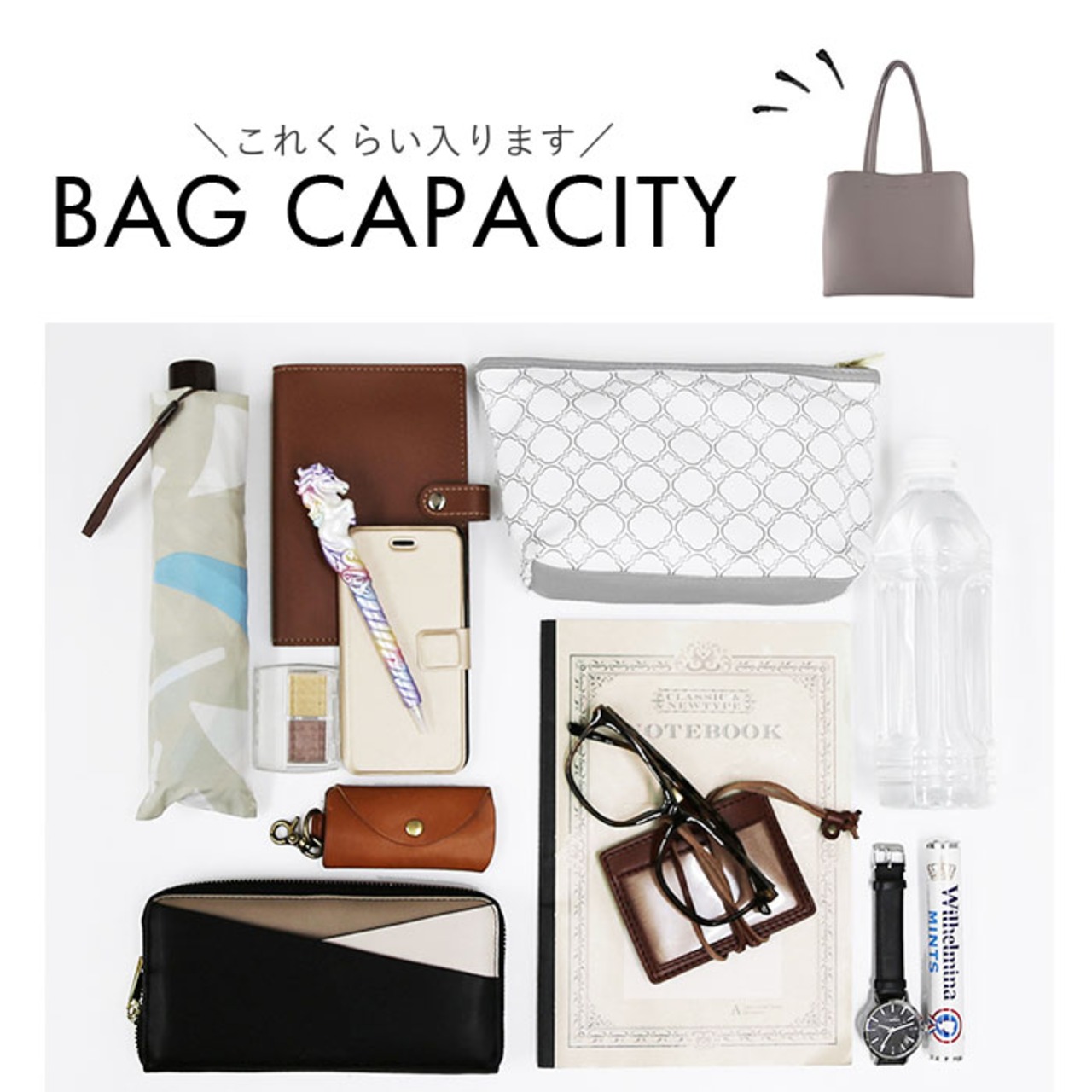 ・B5サイズ対応で長財布やペットボトル、コスメポーチなどがすっきり。必要な物はしっかり収納!