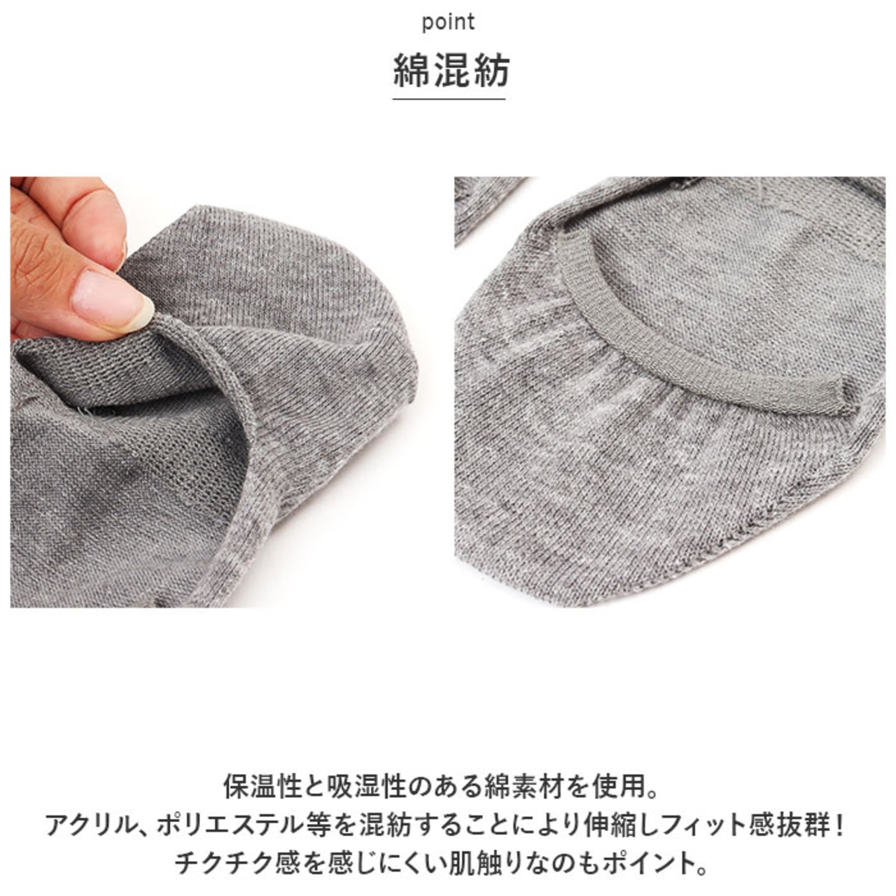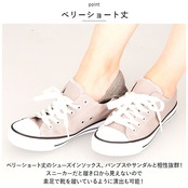 ・ベリーショート丈のシューズインソックス。パンプスやサンダルと相性抜群!スニーカーだと履き口から見えないので素足で靴を履いているように演出も可能!