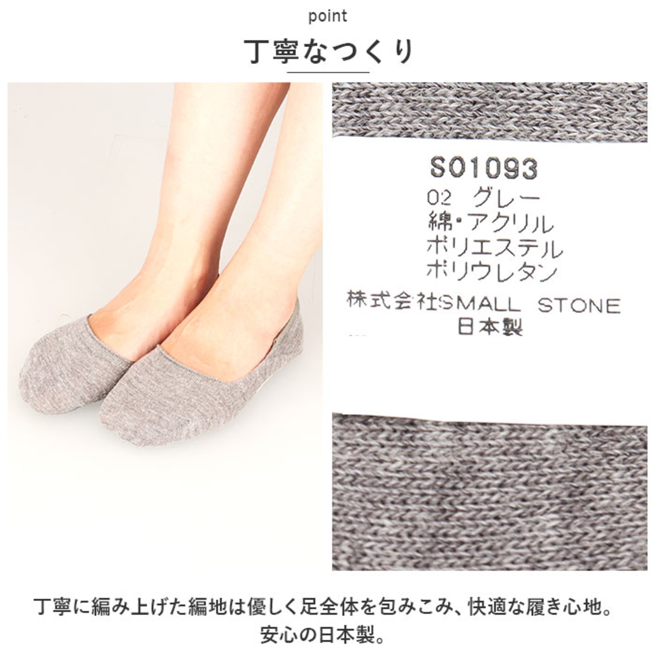 ・丁寧に編み上げた編地は優しく足全体を包みこみ、快適な履き心地。安心の日本製。