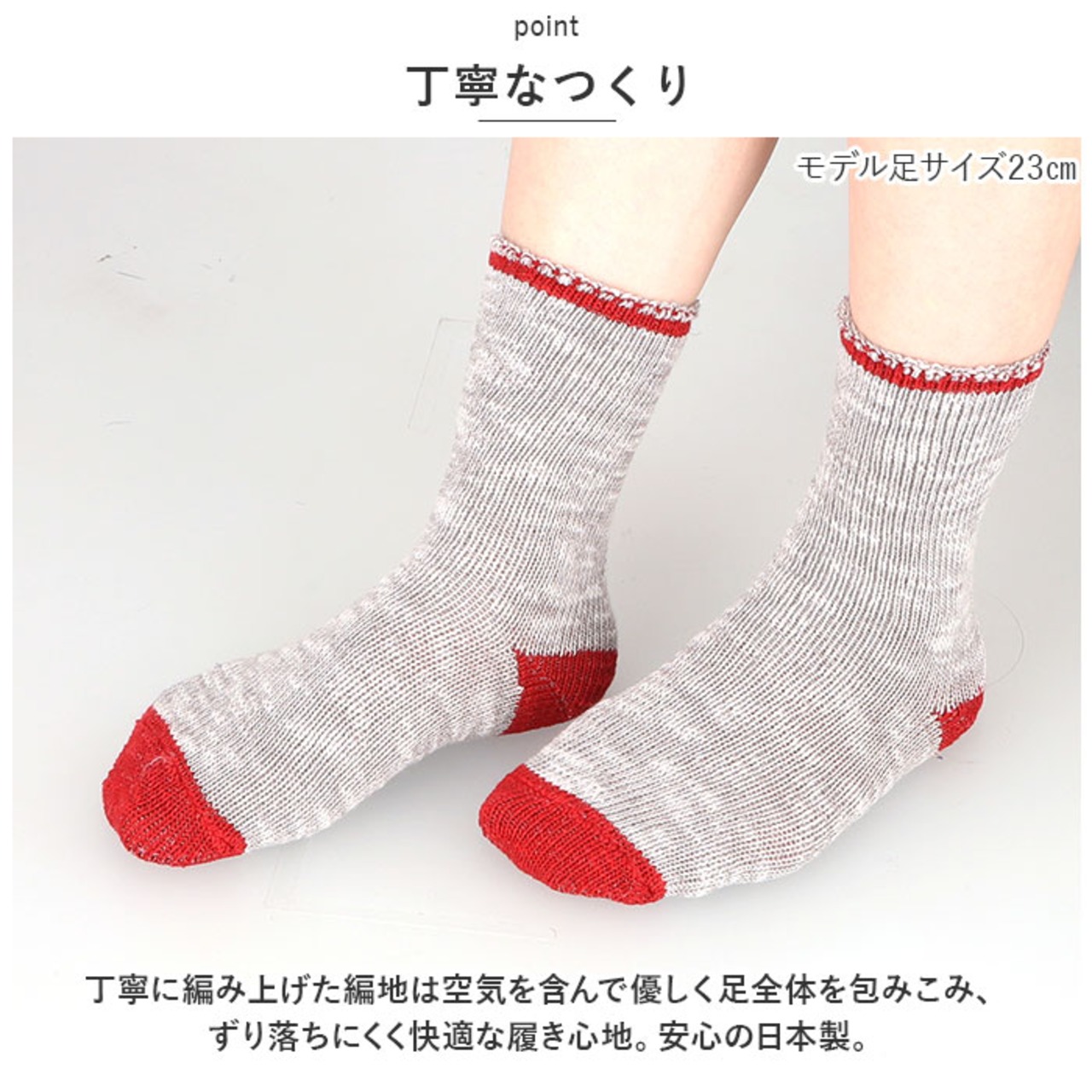 ・丁寧に編み上げた編地は空気を含んで優しく足全体を包みこみ、ずり落ちにくく快適な履き心地。安心の日本製。
