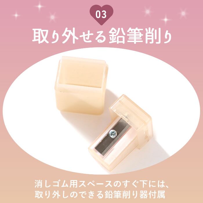 ・消しゴム用スペースには、取り外しのできる鉛筆削り器が付属しているので、削りカスを捨てるときも簡単便利♪