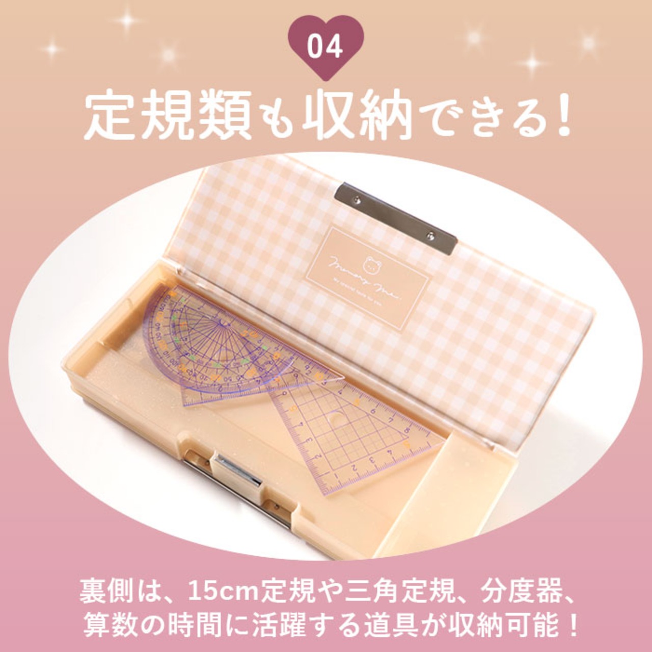 ・ウラ側の扉には、15cm定規や三角定規、分度器など算数の時間に活躍する道具がすっきり収納可能。