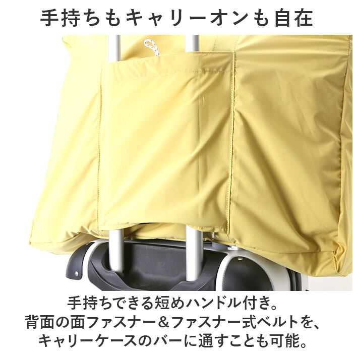 ・手持ちできる短めハンドル付き。背面の面ファスナー&ファスナー式ベルトを、キャリーケースのバーに通すことも可能。