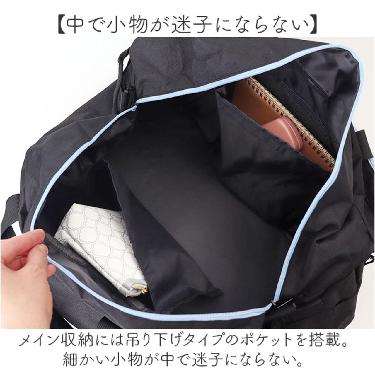 ・メイン収納には吊り下げタイプのポケットを搭載。細かい小物が中で迷子にならない。