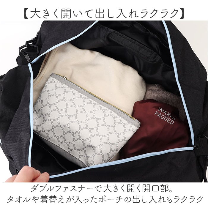 ・ダブルファスナーで大きく開く開口部。タオルや着替えが入ったポーチの出し入れもラクラク