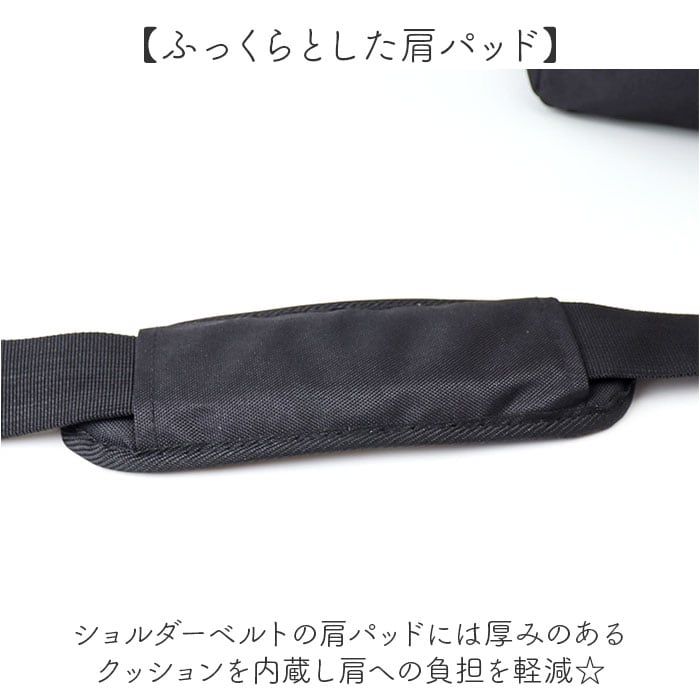 ・ショルダーベルトの肩パッドには厚みのあるクッションを内蔵し肩への負担を軽減☆