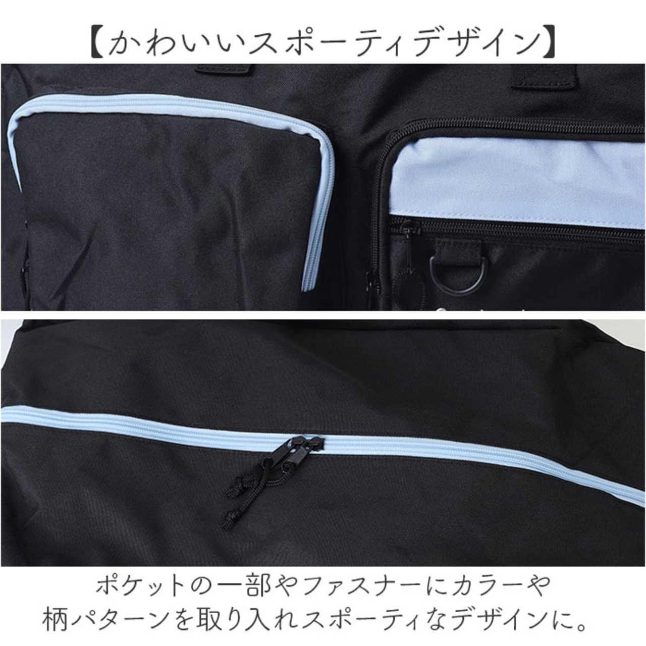 ・ポケットの一部やファスナーにカラーや柄パターンを取り入れスポーティなデザインに。※