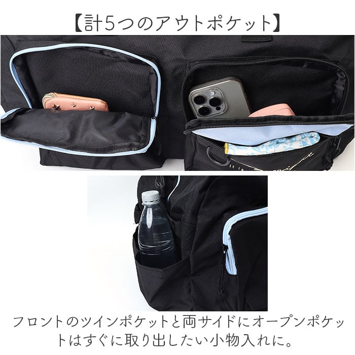 ・フロントのツインポケットと両サイドにオープンポケットはすぐに取り出したい小物入れに。