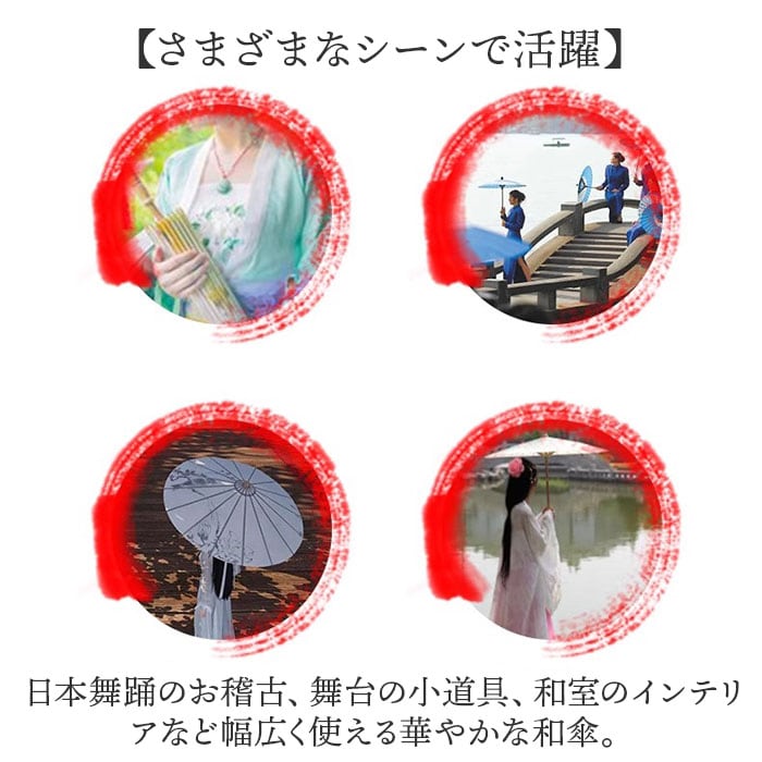 ・日本舞踊のお稽古、舞台の小道具、和室のインテリアなど幅広く使える華やかな和傘。