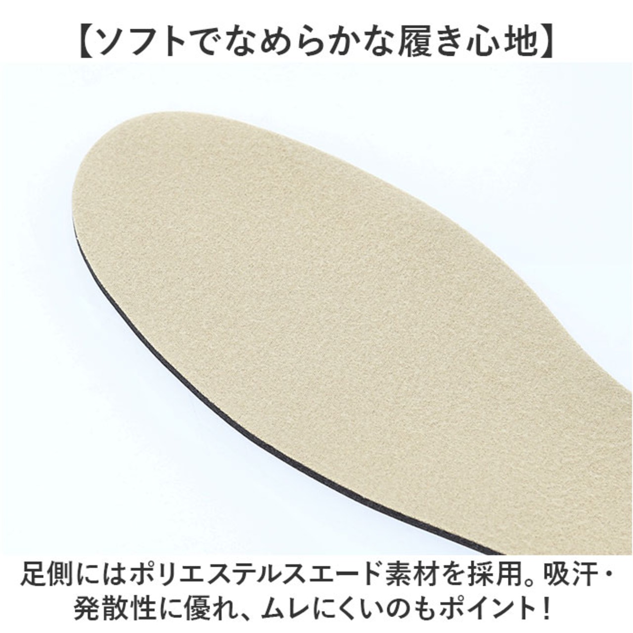 ・足側にはポリエステルスエード素材を採用。吸汗・発散性に優れ、ムレにくいのもポイント!
