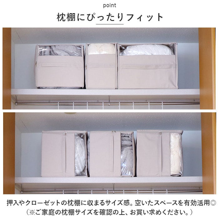 ・押入やクローゼットの枕棚に収まるサイズ感。空いたスペースを有効活用◎(※ご家庭の枕棚サイズを確認の上、お買い求めください。)