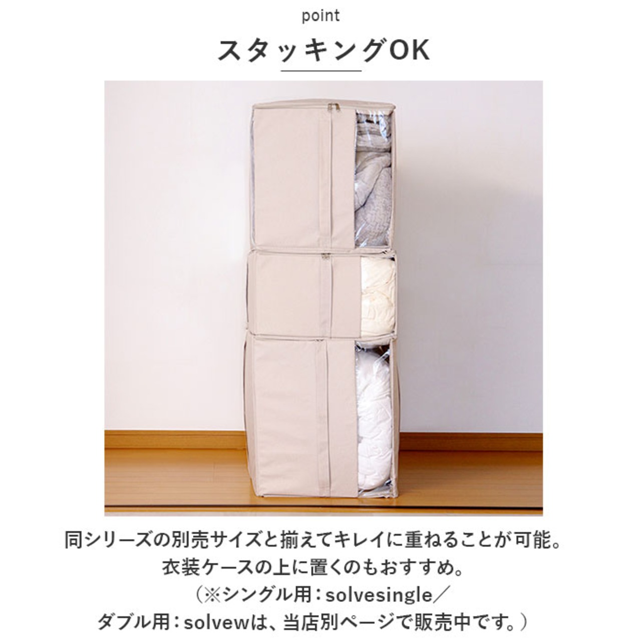 ・同シリーズの別売サイズと揃えてキレイに重ねることが可能。衣装ケースの上に置くのもおすすめ。(※シングル用:solvesingle/ダブル用:solvewは、当店別ページで販売中です。)