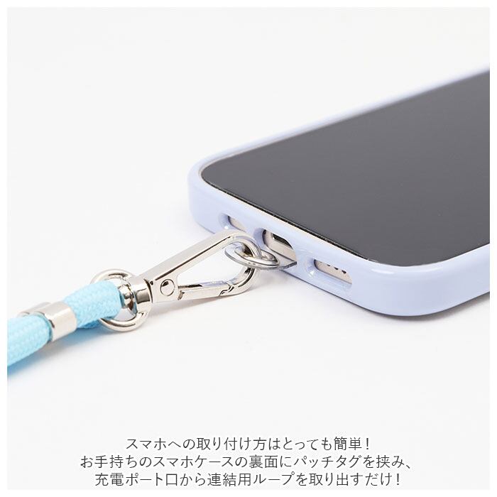 ・スマホへの取り付け方はとっても簡単!お手持ちのスマホケースの裏面にパッチタグを挟み、充電ポート口から連結用ループを取り出すだけ!