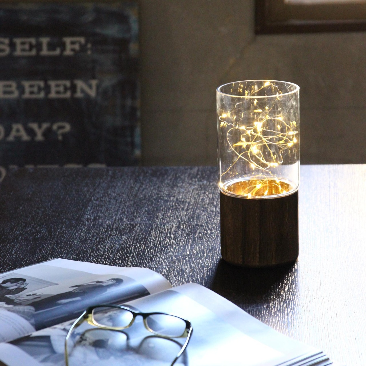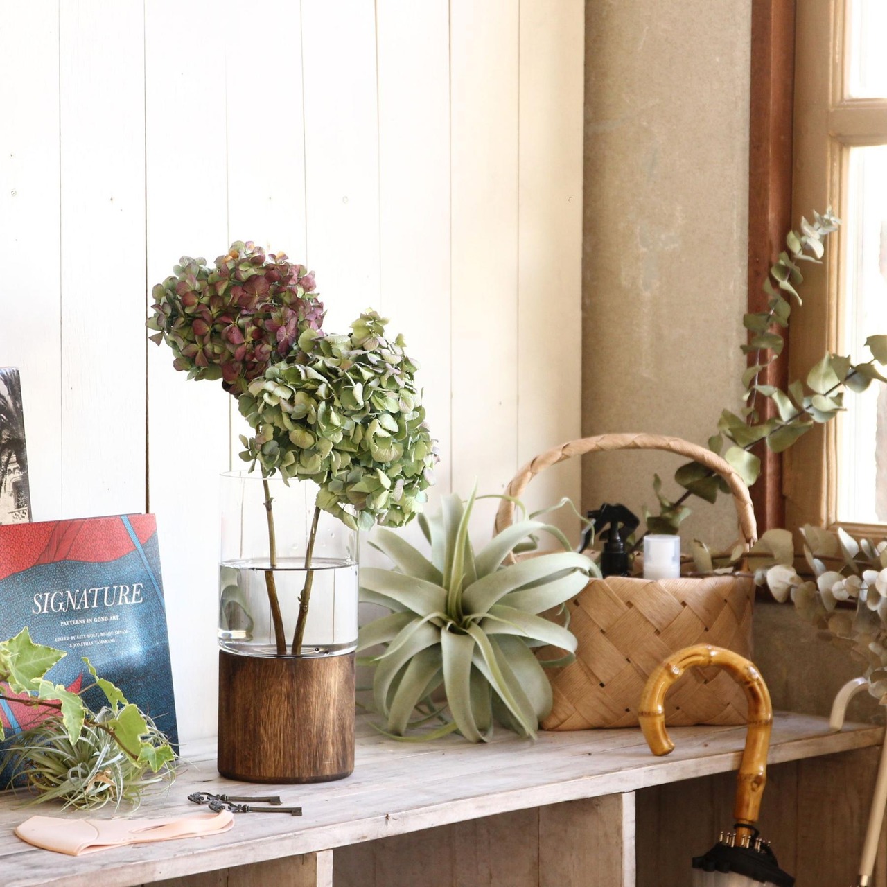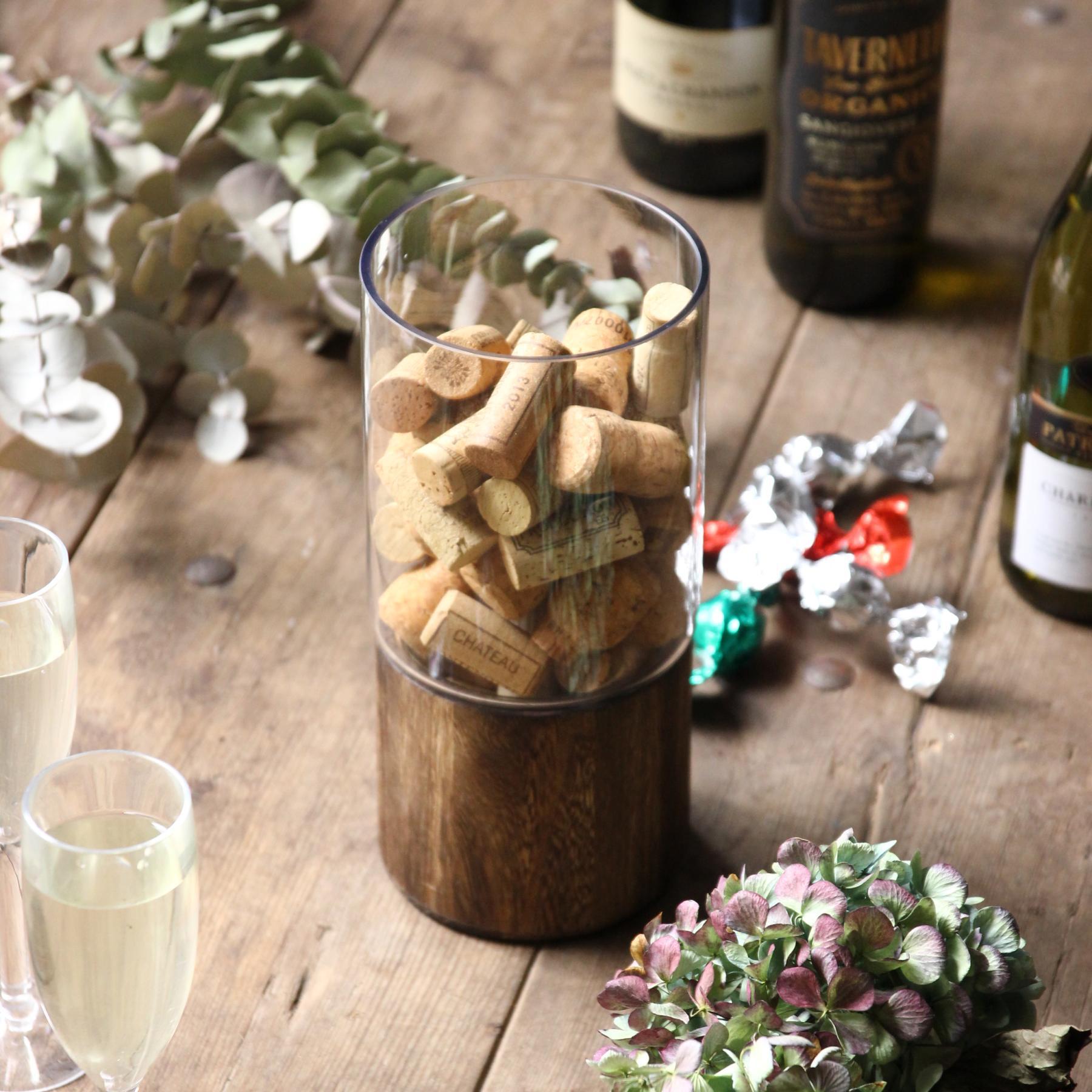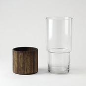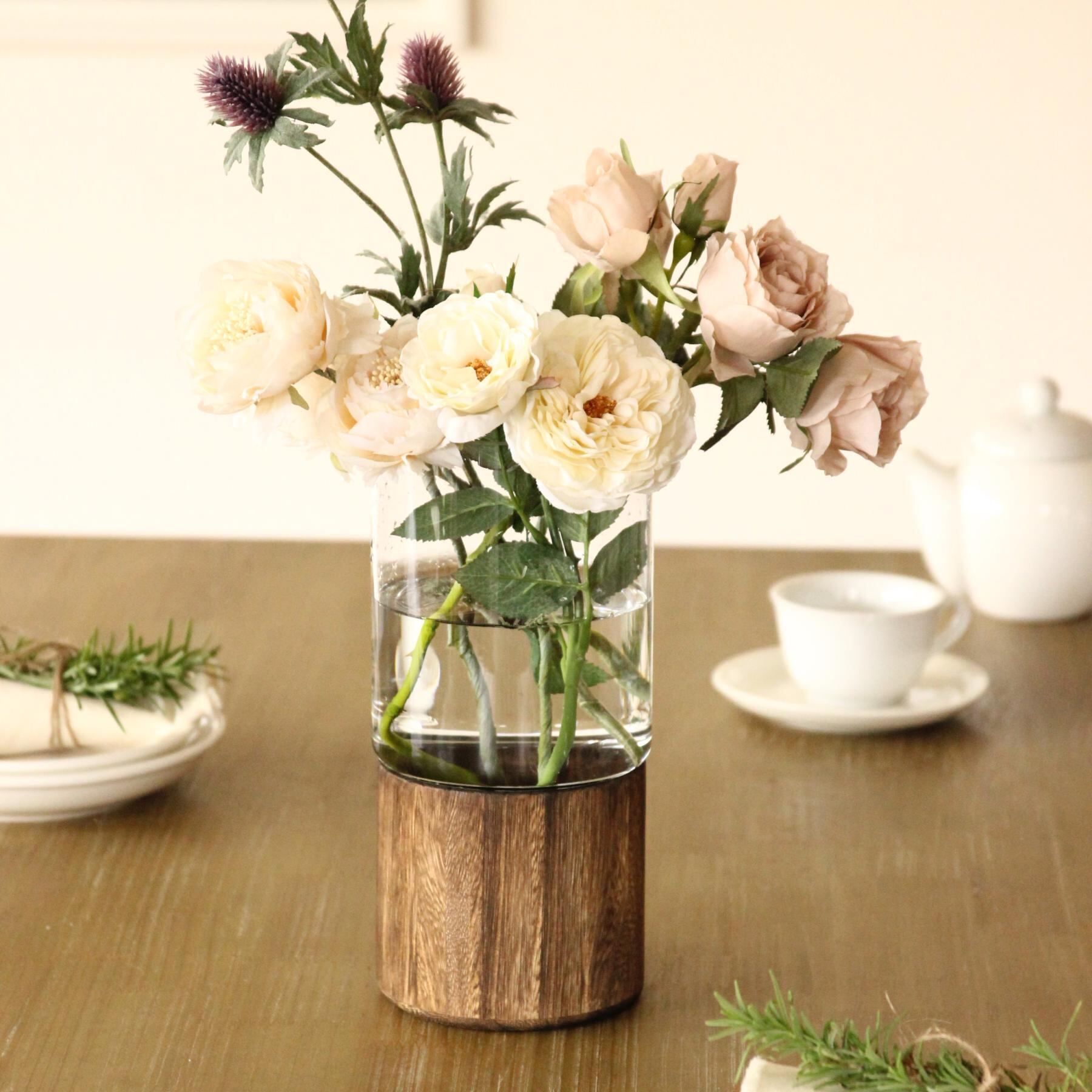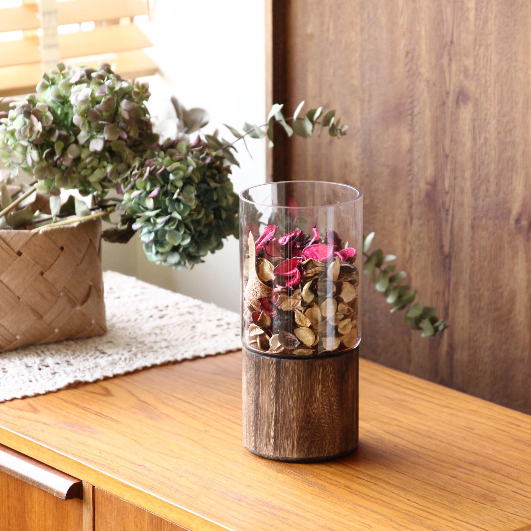 ・ガラスと木を組み合わせたデザイン性の高い生けやすいサイズのフラワーベース。