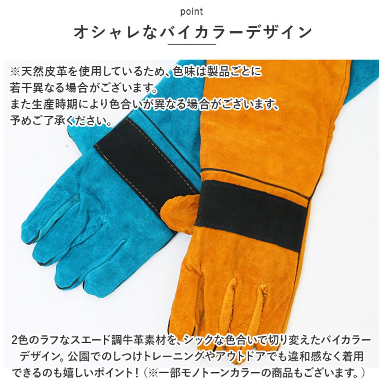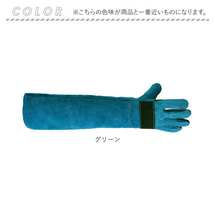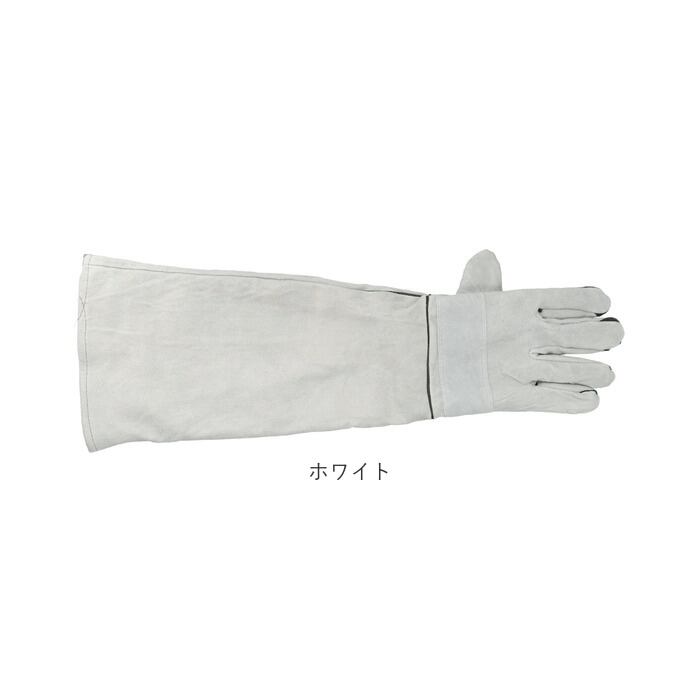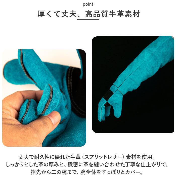 ・丈夫で耐久性に優れた牛革(スプリットレザー)素材を使用。しっかりとした革の厚みと、緻密に革を縫い合わせた丁寧な仕上がりで、指先から二の腕まで、腕全体をすっぽりとカバー。