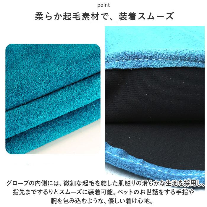 ・グローブの内側には、微細な起毛を施した肌触りの滑らかな生地を採用し、指先までするりとスムーズに装着可能。ペットのお世話をする手指や腕を包み込むような、優しい着け心地。