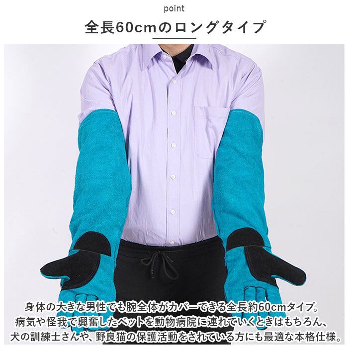 ・身体の大きな男性でも腕全体がカバーできる全長約60cmタイプ。病気や怪我で興奮したペットを動物病院に連れていくときはもちろん、犬の訓練士さんや、野良猫の保護活動をされている方にも最適な本格仕様。