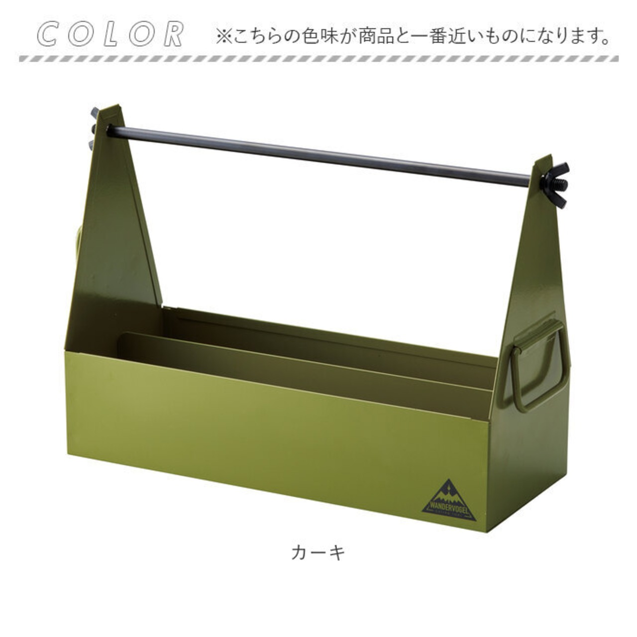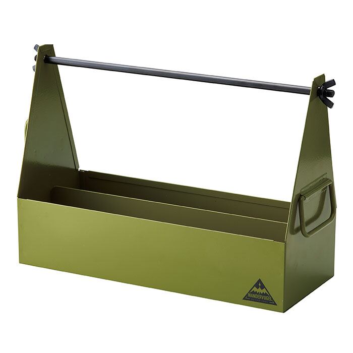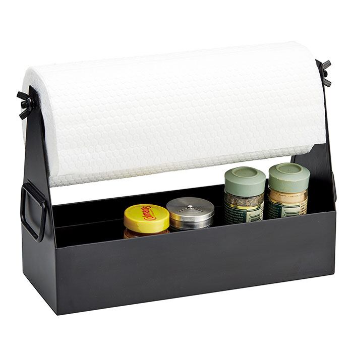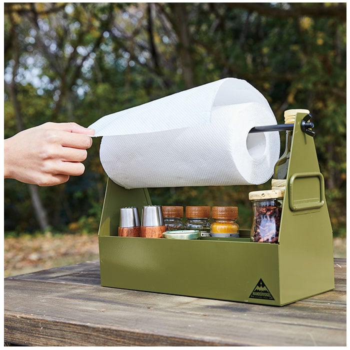 ・キッチンペーパー取り付け用のバーを持ち手にすれば、工具やペグなどをまとめるツールボックスに。