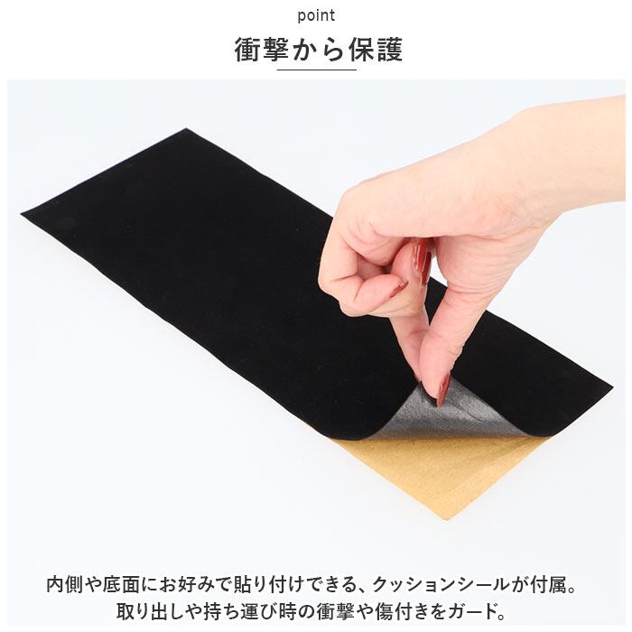 ・内側や底面にお好みで貼り付けできる、クッションシールが付属。取り出しや持ち運び時の衝撃や傷付きをガード。