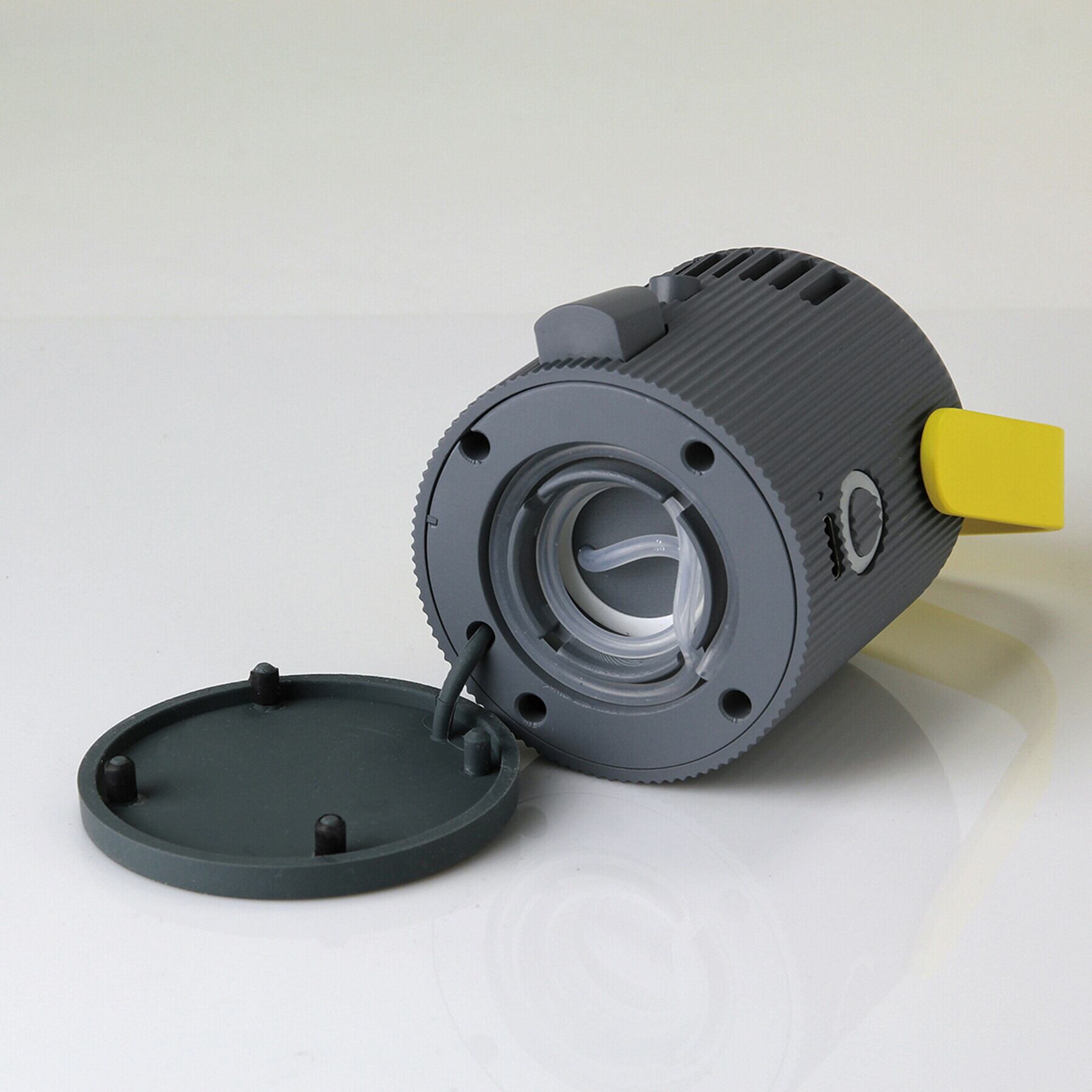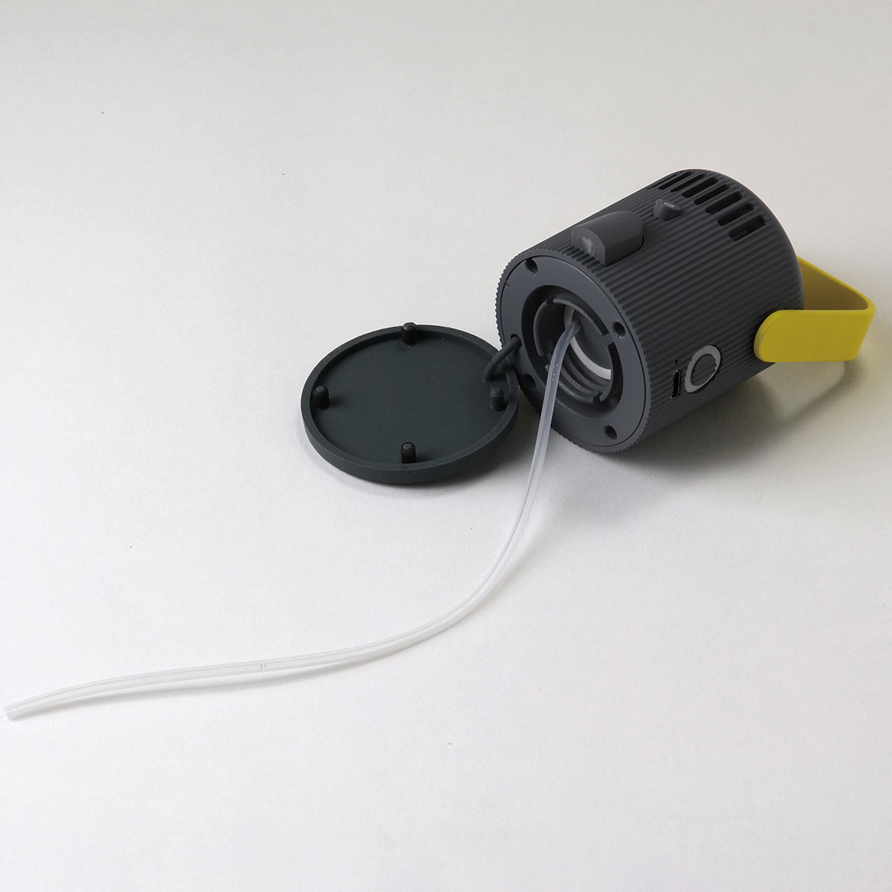 ・使い方は簡単。流通している500ml以内のペットボトル(口径28mm)をきれいに洗浄し、水道水をいれます。本体側面のカバーを外し、吸水チューブを取り出してペットボトル内部に入れ、本体が止まるまで回して取り付け。