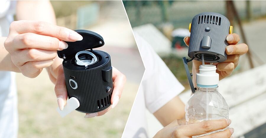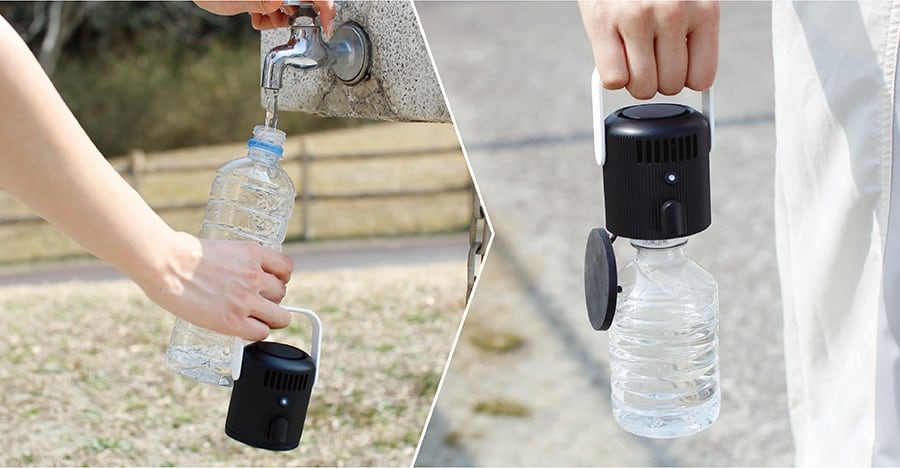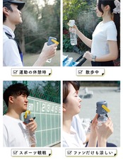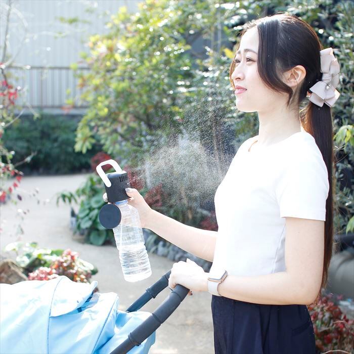 ・水が入ったペットボトルに取り付けるだけで、スポーツシーンやアウトドア、フェスなど屋外で、簡単に風とミストで涼むことができる扇風機。