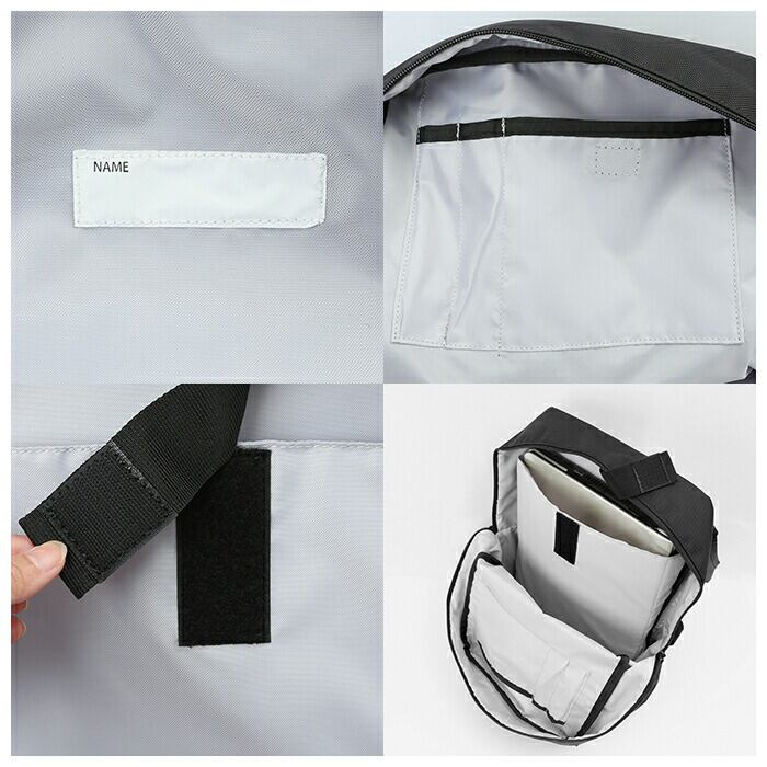 ・メイン収納はラウンドファスナーで荷物の出し入れがラクラク。B4サイズがすっぽり入り、教科書や筆記用具が余裕で入るサイズ感。PCやタブレットが収納できるクッション付きの面ファスナーポケットもあって便利、15インチ以内のPCが収納可能。