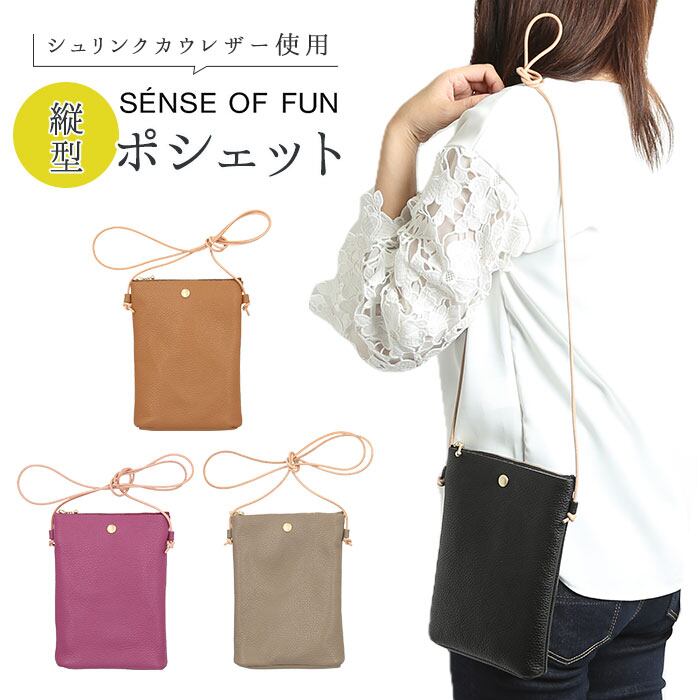 ショルダーバッグ レディース 斜め掛け レザー 日本製 通販 斜めがけ 大人 革 小さめ おしゃれ ブランド SENSE OF FUN センスオブファン 29115 シュリンクカウレザー 縦型 ポシェット 上品 きれいめ シンプル 皮革製 牛革