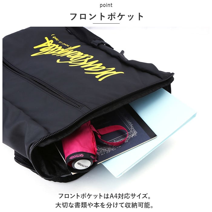 ・フロントポケットはA4対応サイズ。大切な書類や本を分けて収納可能。