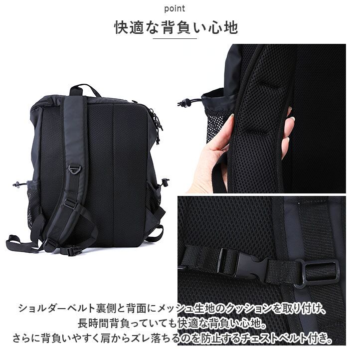 ・ショルダーベルト裏側と背面にメッシュ生地のクッションを取り付け、長時間背負っていても快適な背負い心地。