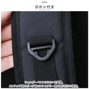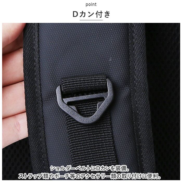 ・ショルダーベルトにDカンを装備。ストラップ類やポーチ等のアクセサリー類の取り付けに便利。