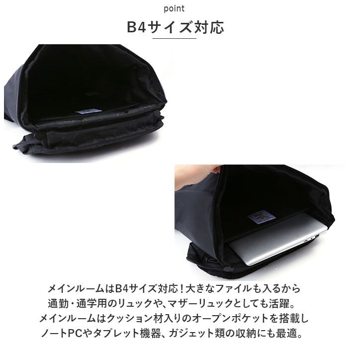 ・メインルームはB4サイズ対応!大きなファイルも入るから通勤・通学用のリュックや、マザーリュックとしても活躍。