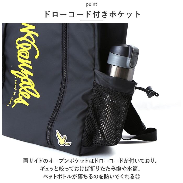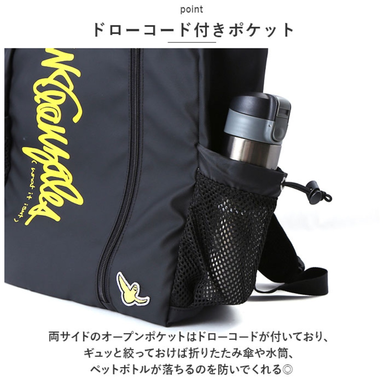 ・両サイドのオープンポケットはドローコードが付いており、ギュッと絞っておけば折りたたみ傘や水筒、ペットボトルが落ちるのを防いでくれる◎